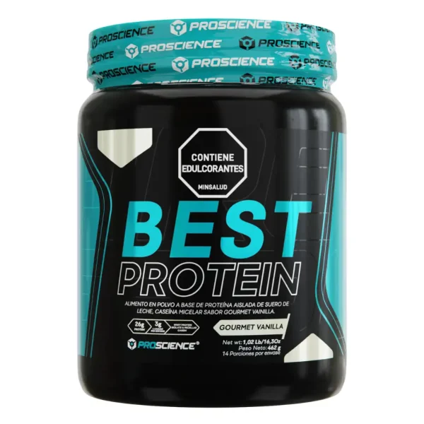 Best Protein de Proscience combina suero de leche aislado, caseína micelar y leucina. Está disponible en 1, 2 y 4 libras. Ideal para quienes buscan una proteína completa y balanceada.