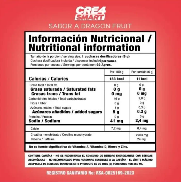 INGREDIENTES: Maltodextrina, Creatina monohidrato, acidulante (ácido cítrico), Sabor dragon fruit, cafeína, Astragin, edulcorante (Splenda – Sucralosa).