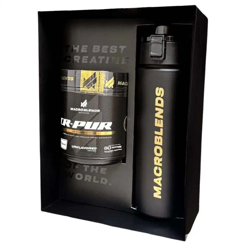 Esta edición se presenta en una caja premium que incluye un termo Macroblends, ideal para llevar tu suplementación al entrenamiento, al trabajo o a cualquier rutina diaria.