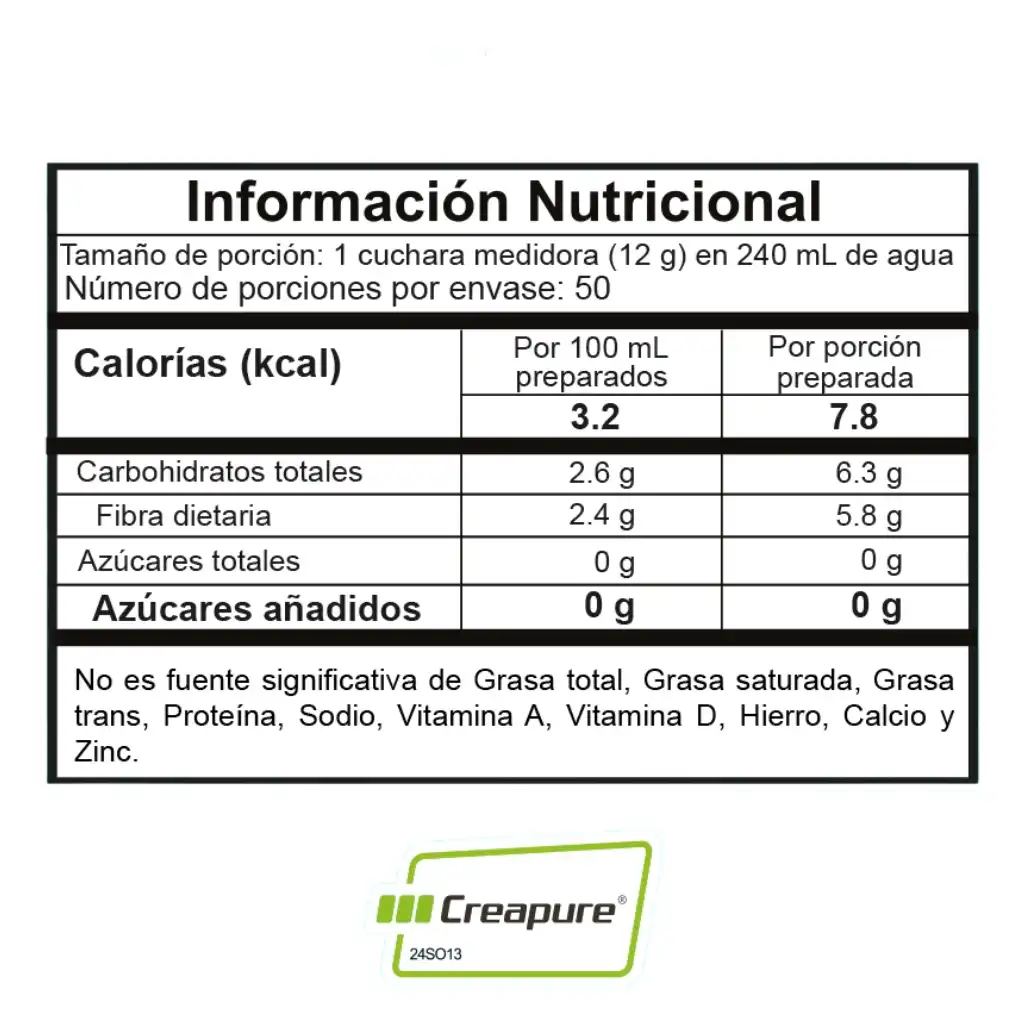 INGREDIENTES NATURAL: Polidextrosa, Ácido α -Metil Guanido-Acético, Taurina, Dióxido de Silicio (Anticompactante), Cafeína, Benzoato de Sodio (Conservante) (600mg/L).