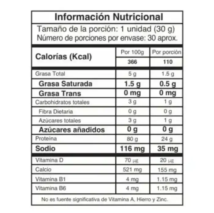 - Contiene 24 g de proteína por porción en 30 g de alimento.