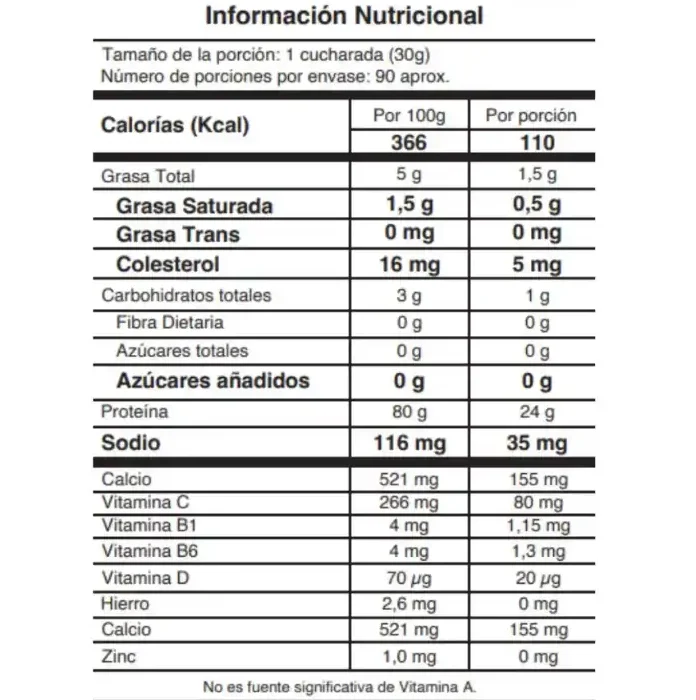 • Contiene 24 g de proteína por porción en 30 g de alimento.
