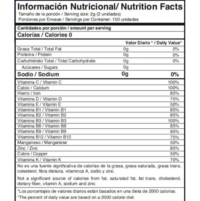 Vitamina A, Vitamina C, Vitamina D, Vitamina E, Vitamina K, Vitamina B1, Vitamina B2, Vitamina B6,Vitamina B9, Vitamina B12, Vitamina B3, Calcio, Hierro, Zinc, Magnesio.