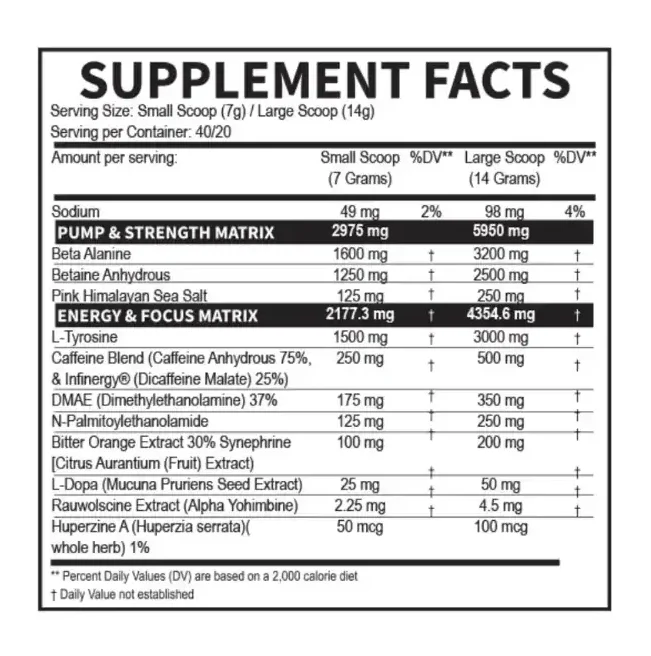 - L-tirosina y huperzina, ingredientes asociados al estado de alerta, enfoque mental y motivación durante el entrenamiento.