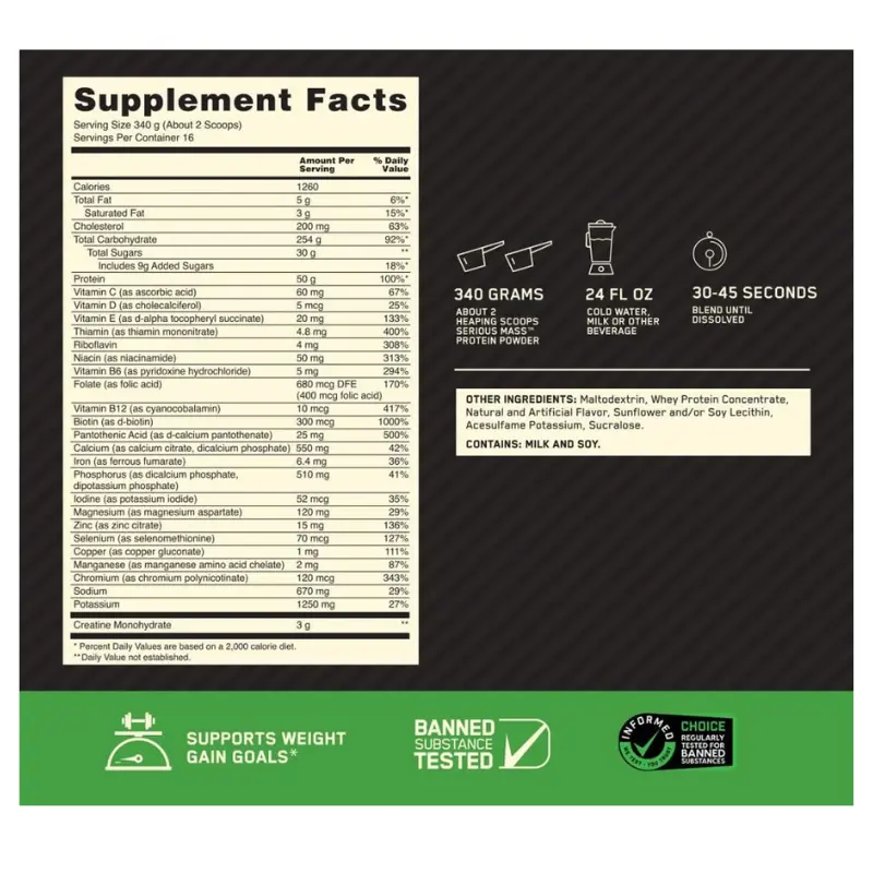 Serious Mass es un suplemento diseñado para usarse como ganador de peso, formulado para quienes desean aumentar su volumen muscular obteniendo resultados satisfactorios. Su consumo calórico, su combinación de proteínas, carbohidratos y micronutrientes proporciona el soporte necesario para entrenamientos exigentes y recuperación muscular óptima.