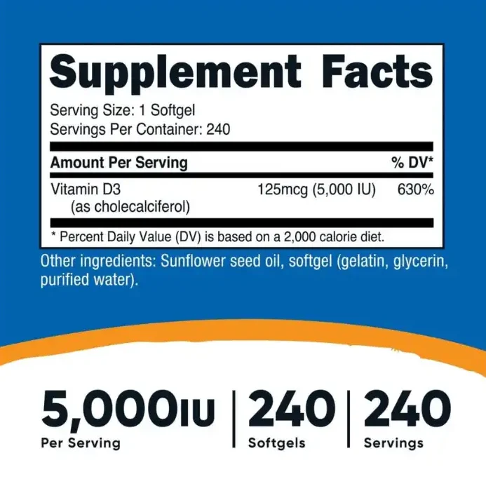 Nuestra Vitamina D3 en Softgels marca Nutricost es la clave para una salud sólida y un bienestar vibrante. Estos convenientes softgels contienen la forma superior de vitamina D3, el colecalciferol, que es esencial para mantener huesos fuertes y un sistema inmunológico resiliente.